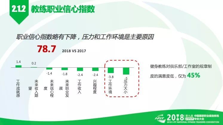 2018年健身教练的职业信心指数是78.7,同比2017年下降1.1。数据表明:工作压力、工作环境等外在因素成为信心指数下降的主要原因。