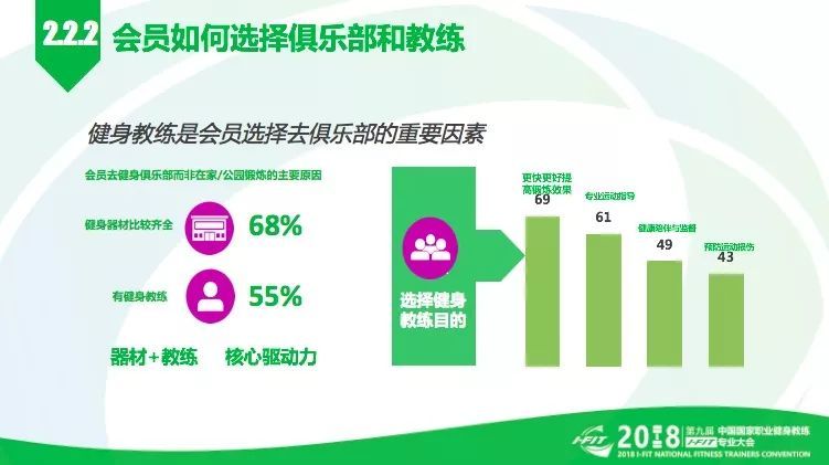 会员选择去俱乐部锻炼的原因是:68%的会员是因为俱乐部的健身器材比较齐全,55%的人是因为俱乐部有健身教练,所以器材+教练成为俱乐部的核心驱动力。
