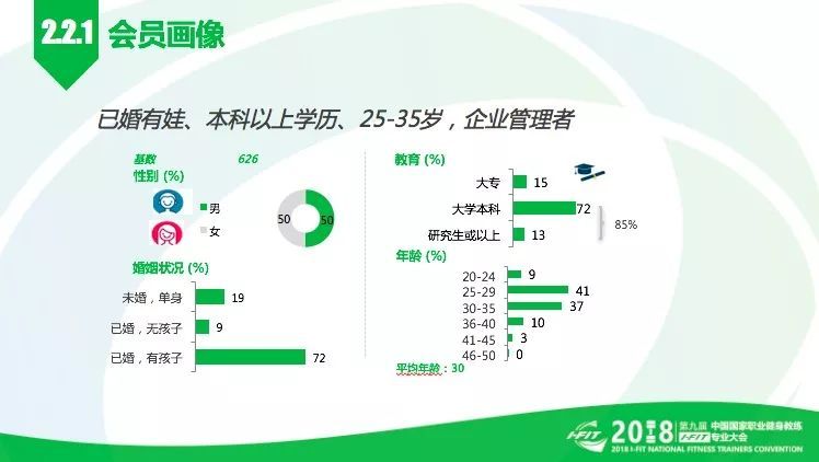 五、健身人群画像:男女比例均衡,大部分已婚有娃,占72%,85%以上的人拥有大学本科以上学历,年龄集中在25-35岁之间,大部分在企业担任管理者,拥有稳定的收入。