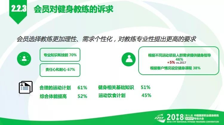 会员会选择什么样的人成为自己的健身教练:根据调查与历史数据比较,会员需求在不断升级,选择教练更加理性。70%的人看重教练的专业知识和技能,67%的人要求教练必须有责任心和耐心。