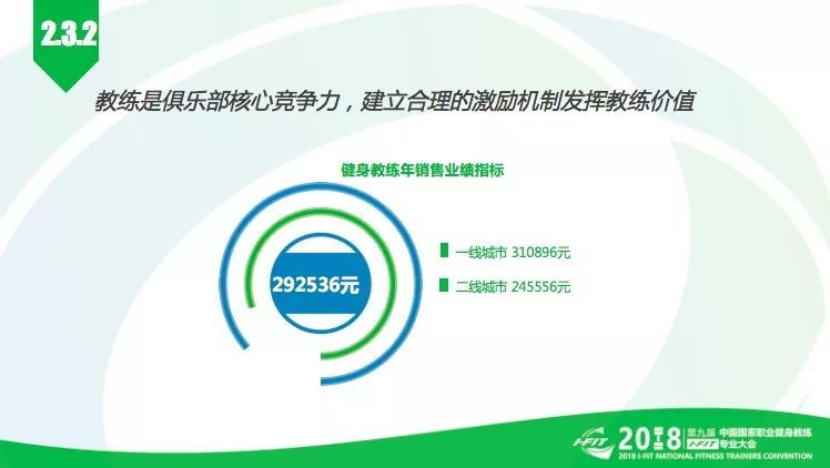 教练创造了俱乐部价值的核心,健身教练直接贡献了产值,他们提供的专业优质服务会吸引更多的会员加入到俱乐部,带动了后续一系列的消费。调查显示,每位健身教练每年需完成的业绩指标为292536元,其中一线城市为310896元,二线城市为245556元。