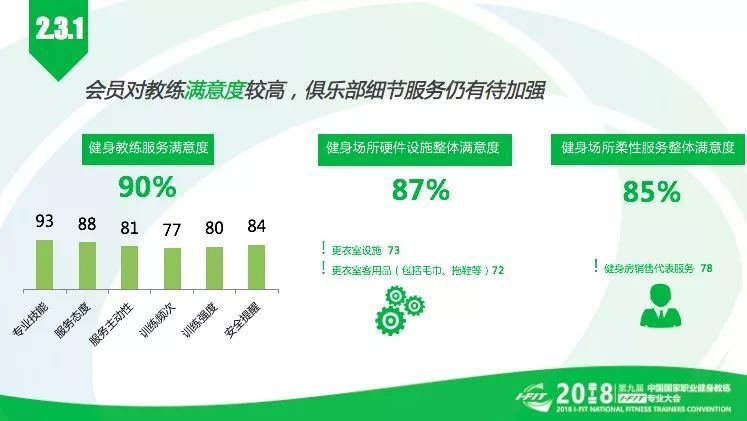 调查发现,会员对健身教练服务整体满意度很高,达到90%,但对俱乐部硬件和柔性服务的满意度略低。