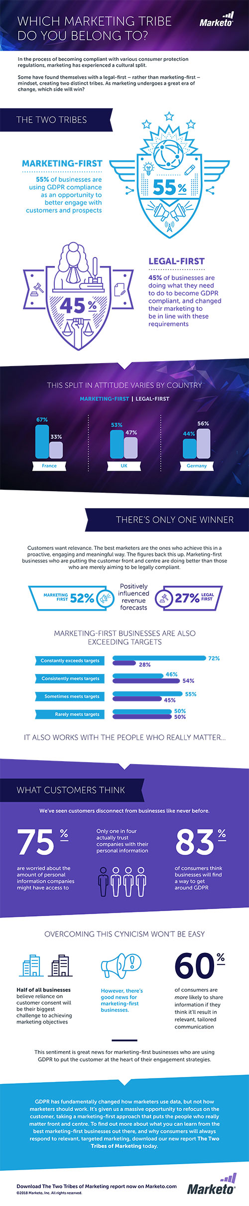 Marketo的新调查发现,3/4的欧洲消费者(75%)担心企业访问个人信息,不到一半的消费者(42%)相信企业会正确使用他们的个人信息。随着GDPR的强制执行,近2/3的消费者(64%)表示他们乐于分享数据以换取好处,这为营销人员提供了机会。