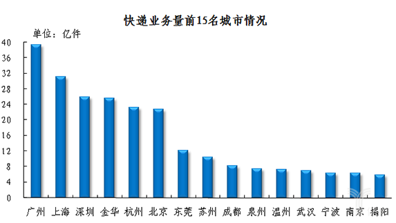 快递业务量排名前十五位的城市依次是广州、上海、深圳、金华(义乌)、杭州、北京、东莞、苏州、成都、泉州、温州、武汉、宁波、南京和揭阳,其快递业务量合计占全部快递业务量的比重达到59.7%。