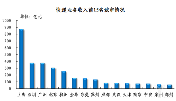 快递业务收入排名前十五位的城市依次是上海、深圳、广州、北京、杭州、金华(义乌)、东莞、苏州、成都、武汉、天津、南京、宁波、泉州、郑州,其快递业务收入合计占全部快递业务收入的比重达到62.8%。