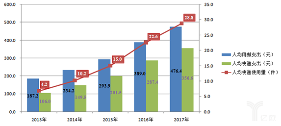2013-2017年人均用邮支出、快递支出和快递使用量情况
