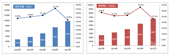 2017年邮政寄递服务业务量累计完成235.8亿件,同比增长1.8%;邮政寄递服务业务收入累计完成353.5亿元,同比增长15.2%。