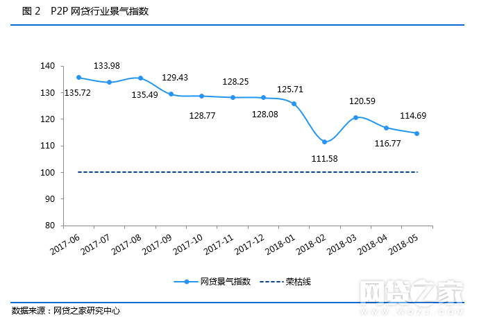 2018年5月中国网贷景气指数为114.69,环比上月出现小幅下降。或因备案登记工作顺延,备案政策不确定性增加,许多平台在消化违规存量完成的同时,自身业务规模也小幅压缩,再加上不确定性的增加,影响了部分出借人的投资决策,因此本月部分平台的成交量同比2017年5月的成交量有所下调,景气指数也随之下降。
