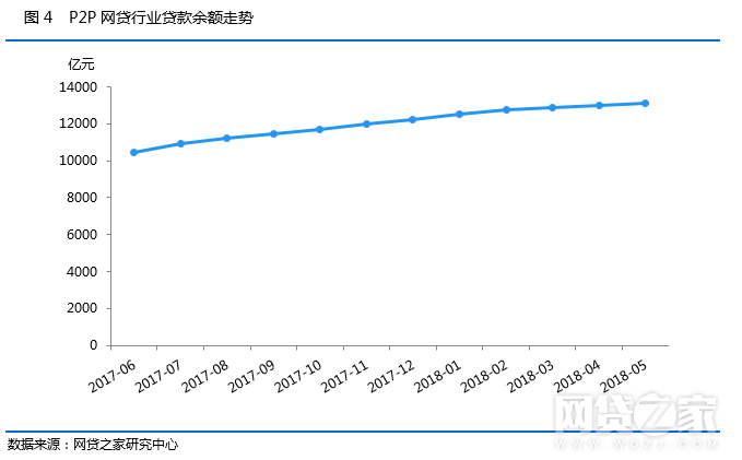 截至2018年5月底,P2P网贷行业贷款余额增至13113.91亿元,环比增加了1.06%。按照57号文件的原计划,本月应该是整改验收工作基本完成,不少平台的违规存量已完全消化,并且随着现金贷等短期项目的清理整顿,不少平台的平均借款期限有所拉长,从而行业贷款余额略有增长。如下图所示。