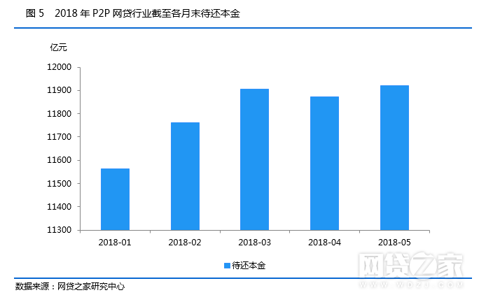 下图展示的是截至统计时点,2018年每月项目撮合完成且尚未偿还的借款本金余额(不包括利息部分),P2P网贷行业本月待还本金为11921.43亿元,较上月小幅上升,这主要是因为本月成交量的小幅增加所致,也说明行业资金流入的增加,投资人对行业发展的信心未减。