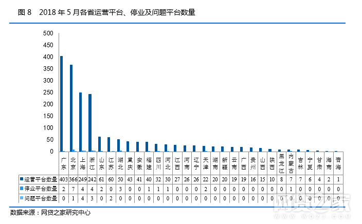 进入统计的30个省市中,5月有25个省市没有发生问题平台,包括跑路、提现困难、经侦介入。停业及问题平台主要分布在北京、上海、浙江等地,其中北京停业及问题平台为8家,上海为8家、浙江为7家。