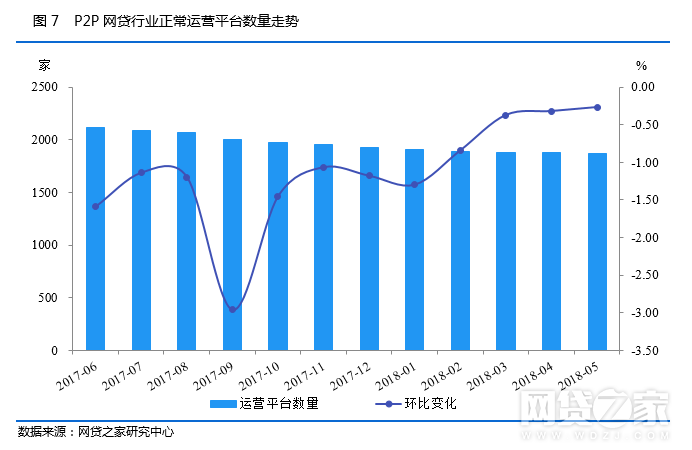 截至2018年5月底,P2P网贷行业正常运营平台数量下降至1872家,相比4月底减少了5家。据不完全统计,5月停业及问题平台数量为38家,其中问题平台10家(提现困难8家、跑路2家),停业平台28家。5月共新发现19家平台,其中1家为新上线平台,其余18家均为历史上线的正常运营平台。另有新发现停业及问题平台9家,此外有5家平台在5月重新恢复发标。截至2018年5月底,累计停业及问题平台达到4270家,P2P网贷行业累计平台数量达到6142家(含停业及问题平台)。