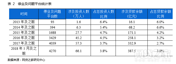 截至2018年5月底,问题平台历史累计涉及的投资人数约为66.1万人(不考虑去重情况),占总投资人数的比例约为3.8%,涉及贷款余额约为387.5亿元,占2018年5月底行业贷款余额的比例约为3.0%。