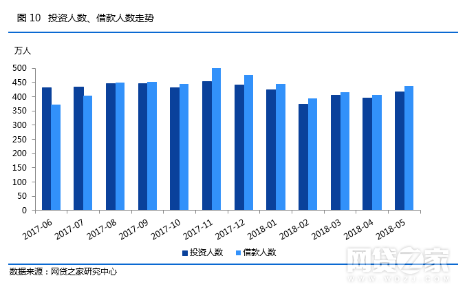 5月P2P网贷行业的活跃投资人数、活跃借款人数分别为416.51万人、436.6万人,其中活跃投资人数环比上升5.42%,活跃借款人数环比上升7.63%。本月网贷行业人气出现了一定程度的回升,主要原因在于“518理财节”期间,平台加息、优惠券活动不断,获得了投资人的积极参与,带动网贷行业成交量上升的同时也带动网贷人气回升。