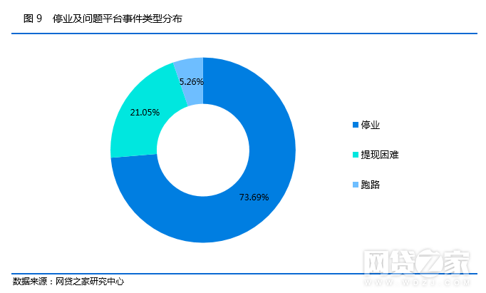 5月共有10家问题平台,28家停业平台。其中,停业类型占比最多,为73.69%。提现困难类型占比为21.05%,跑路类型占比为5.26%。