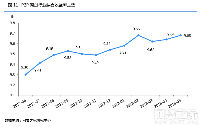 2018年5月,网贷行业综合收益率为9.68%,环比小幅上升4个基点(1个基点=0.01%),同比上升47个基点。本月综合收益率有所上升,一方面是因为平台期限相对较长的借款项目数量的增加,另一方面因“518理财节”,不少平台进行了加息活动。