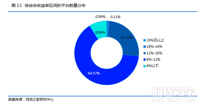 主流综合收益率区间仍分布在8%-12%,平台占比为64.57%;其次为综合收益率在12%-18%的平台,占比为25.52%,8%以下低息平台占比为8.84%,24%及以上的高息平台占比仅为0.11%。