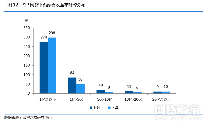 本文选取769家平台作为样本,如下图所示,本文根据样本平台本月成交量体量进行分层,数据表明成交量在1亿元以上的平台有123家综合收益率上升,74家收益率下降,其中成交量在20亿元及以上的平台有9家收益率上升,10家收益率下降;但1亿元以下的平台有274家平台收益率上升,有298家平台收益率下降。