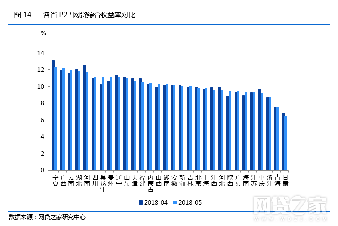 从5月各省市网贷综合收益率变动情况来看,30个省市中,共有13个省市的综合收益率环比出现上升,下降幅度较大的三省是重庆、宁夏和河南,分别下降了90、87和48个基点。而综合收益率上升的17个省市中,上升幅度最大的是黑龙江、陕西和贵州,分别上升了95、54和47个基点。