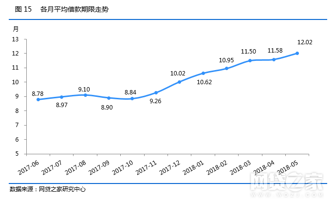 5月网贷行业平均借款期限为12.02个月,环比拉长0.44个月,同比拉长了3.36个月。本月平均借款期限延续近半年拉长趋势,并连续创P2P网贷行业历史新高。这主要受平台资产端限制,部分平台尤其成交量靠前的平台平均借款期限较长,从而拉长了行业平均借款期限。