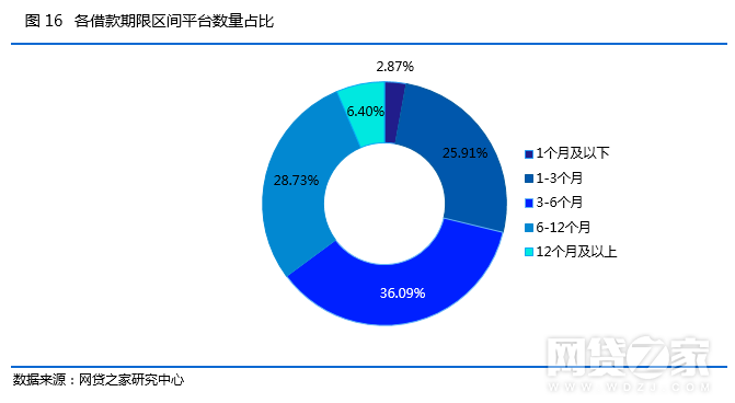 从P2P网贷平台平均借款期限的分布上看,64.86%的平台平均借款期限在半年以内。其中1-3个月区间的平台占比为25.91%,环比下降了1.4个百分点;3-6个月区间的平台占比为36.09%,环比上升了1.5个百分点。12个月及以上的平台占比为6.4%,环比下降了0.35个百分点。