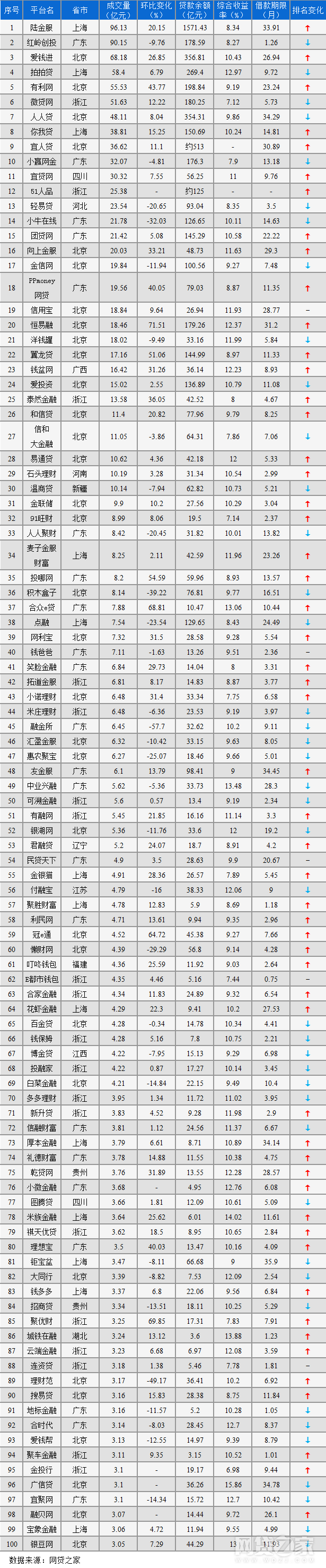 表2 2018年5月P2P网贷行业成交量TOP100平台运营数据