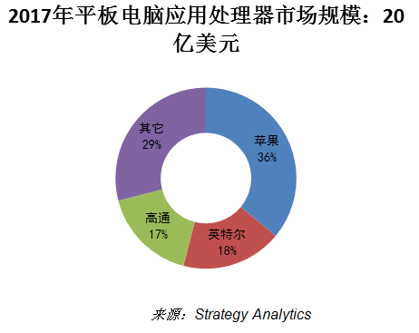Strategy Analytics的研究报告估计,苹果,英特尔,高通,联发科和三星LSI在2017年全球平板应用处理器(AP)市场中占据前五大收益份额。苹果在2017年以36%的收益份额排名第一,紧随其后的分别是英特尔18%和高通17%。