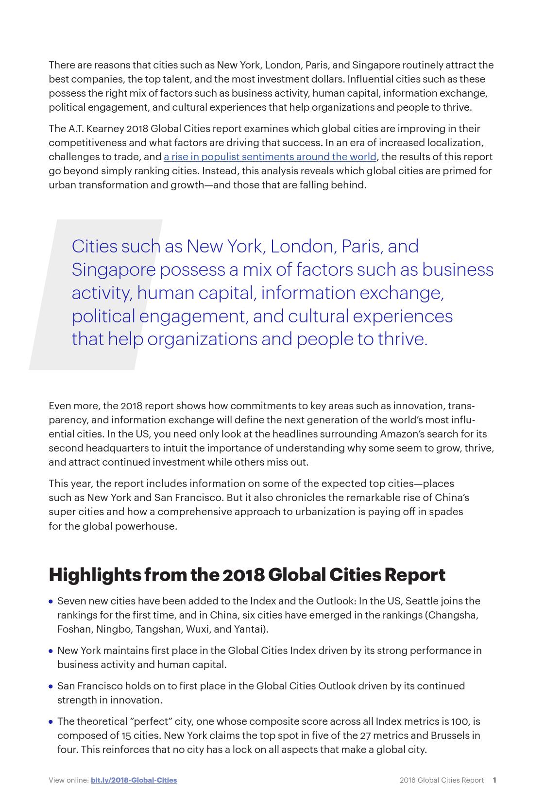 美国科尔尼管理咨询公司(A.T. Kearney)发布了《全球城市报告》,北京、香港和上海入选2018年全球最具影响力城市排行榜前20位。