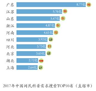2017年科普搜索指数排名前十的省(直辖市)是:广东、江苏、山东、浙江、河南、四川、河北、北京、湖北、上海。
