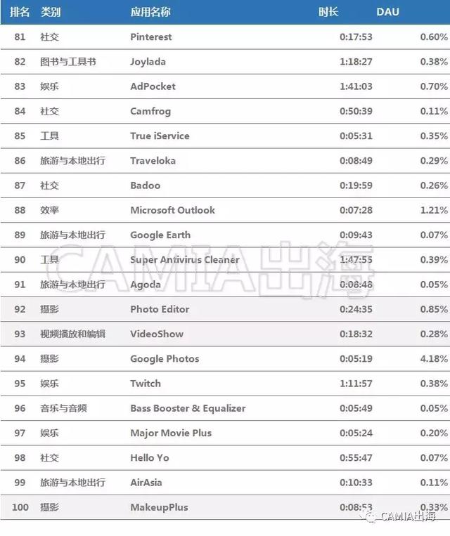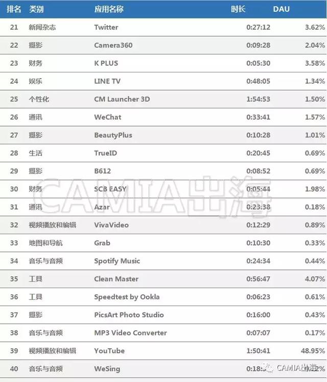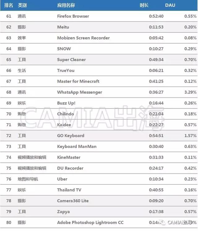 14个摄影类应用中有一半为中国玩家旗下产品。6款视频播放和编辑类应用中有4款为中国玩家旗下产品,其中的3款为短视频应用,分别为抖音国际《Tik Tok》,小影海外《VivaVideo》和乐秀《VideoShow》。
