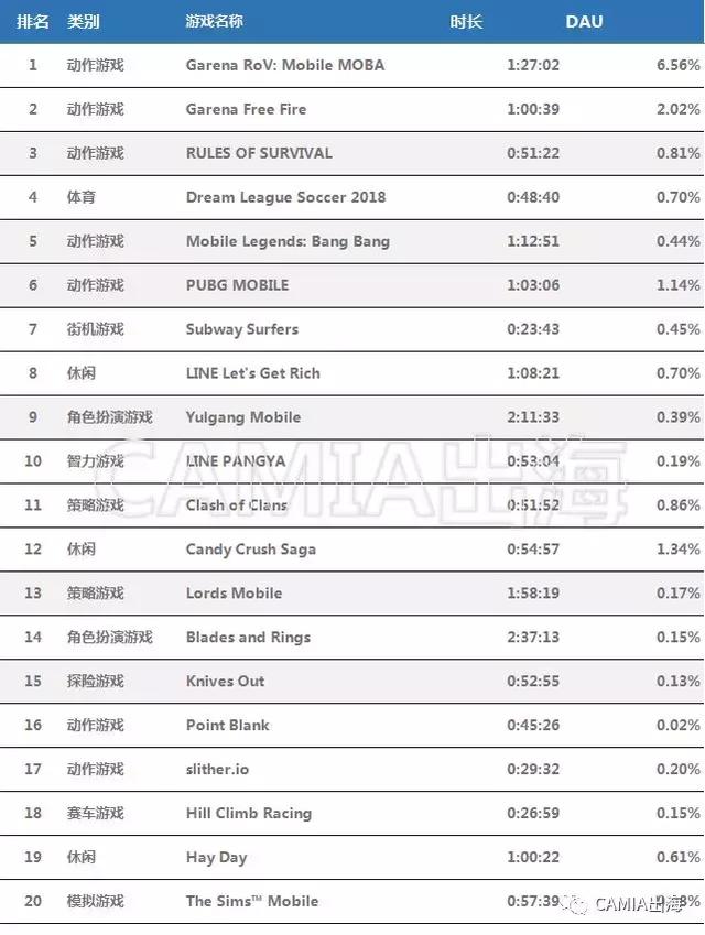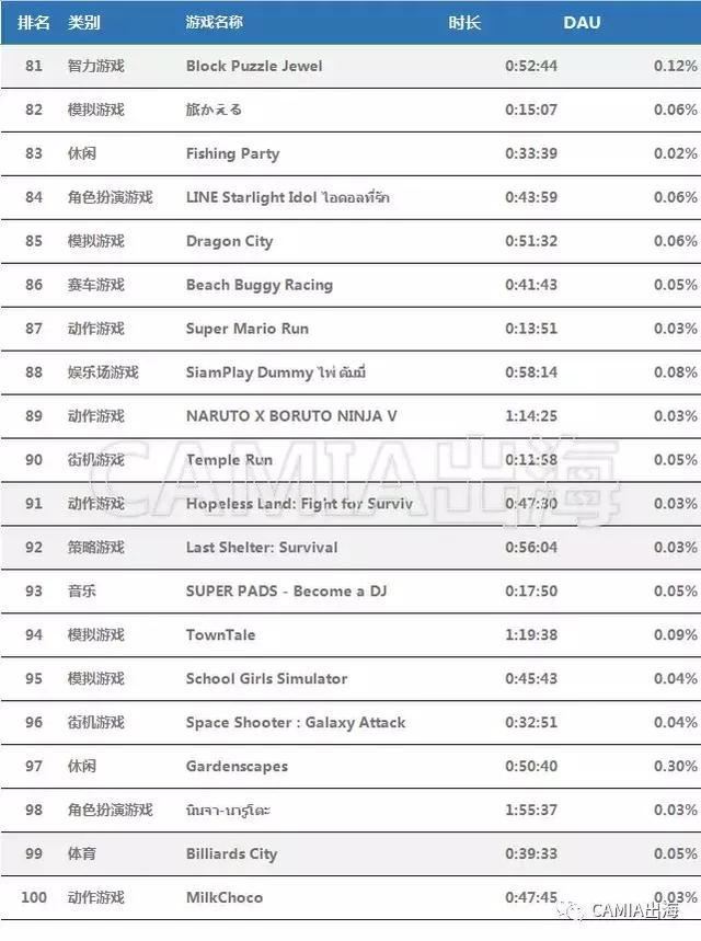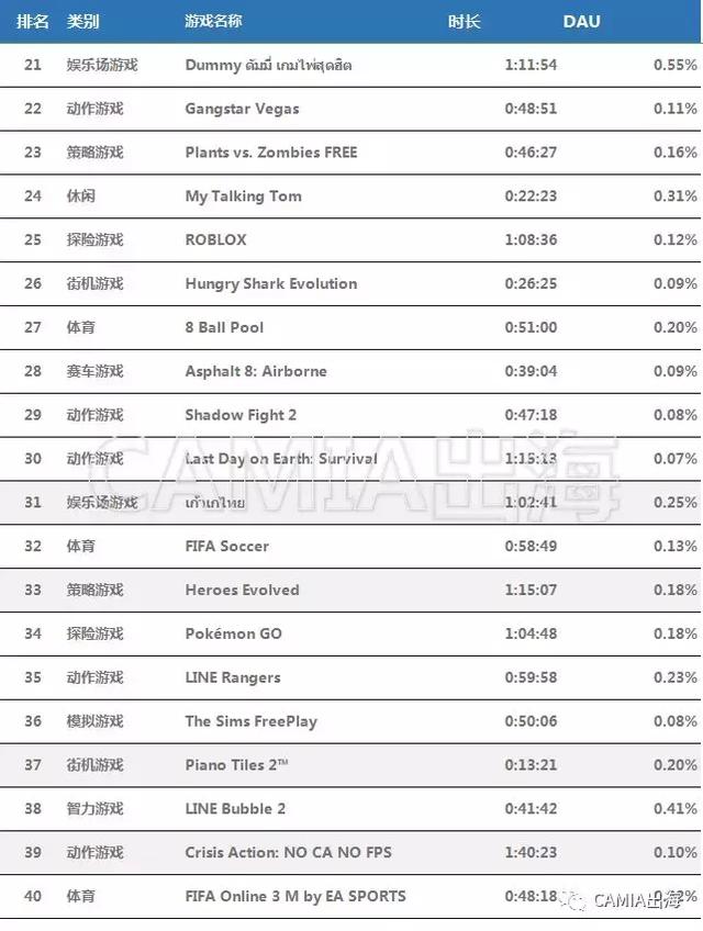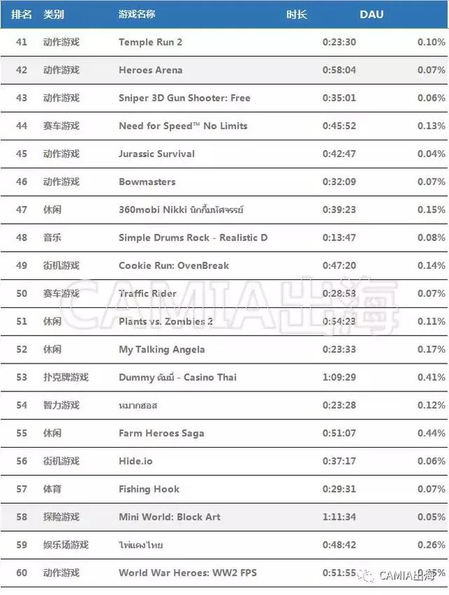 游戏TOP 100下载榜单占幅最大五类游戏依次为动作类、休闲类、赛车类、街机类和模拟类游戏。其中占比最大的动作类占30%,比印尼市场高出10个百分点,同时比菲律宾市场低3个百分点。