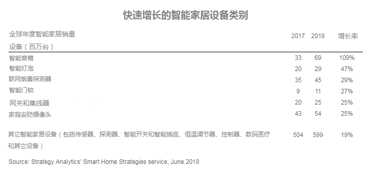 2018年增长最快的产品类别将是智能音箱,如亚马逊的Alexa和谷歌的Google Home等,增长率将达到109%。 其他快速增长的产品包括智能灯泡(如飞利浦Hue),联网的烟雾探测器,智能门锁(如亚马逊的August Smart Lock),网关和集线器、以及安全摄像头(如Google的Nest Cam)。