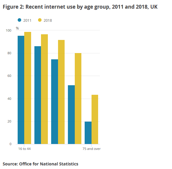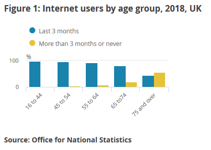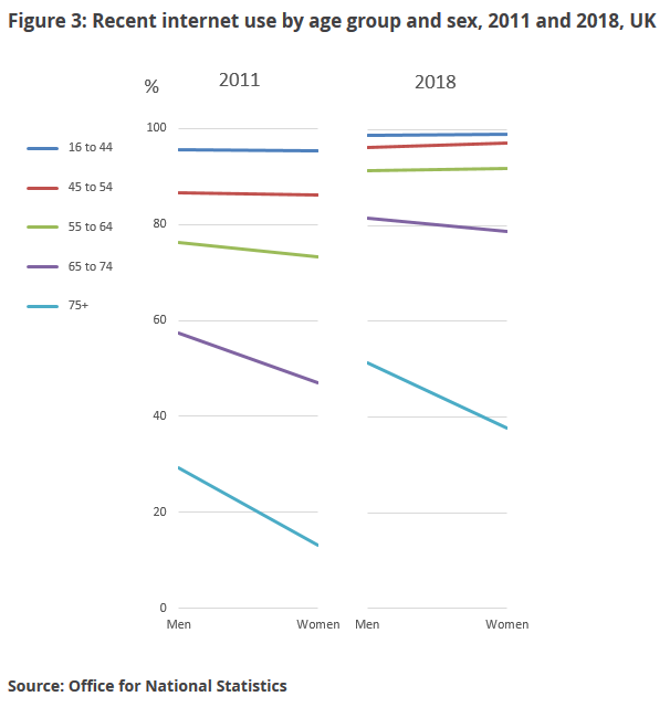 在高龄人群中互联网普及率在男性和女性中的差距更大,例如,65-74岁英国人中互联网在两性中的普及率分别为82%和79%;75岁以上中的数字是51%和38%。