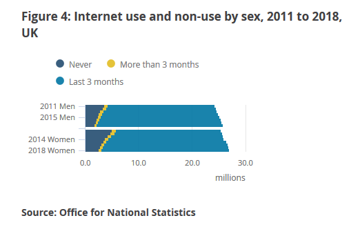 2018英国男性和女性互联网普及率仍有一些差距,分别为91%和89%。2011年互联网在男性和女性中的普及率分别为82%和77%。