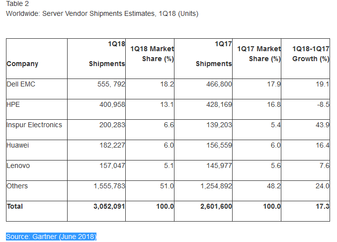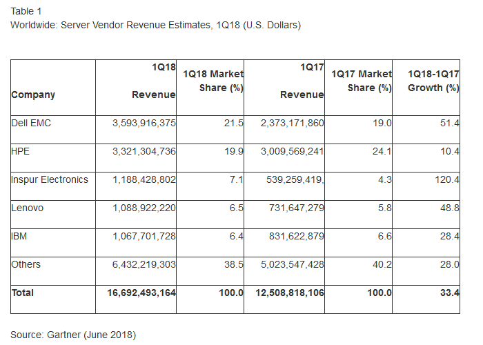 根据2018年第一季度的收入情况,戴尔EMC服务器收入增长51.4%,并以21.5%的市场份额排在全球服务器市场的首位,惠普(19.9%)紧随其后。浪潮电子则在第一季度经历了大幅增长(120.4%)。