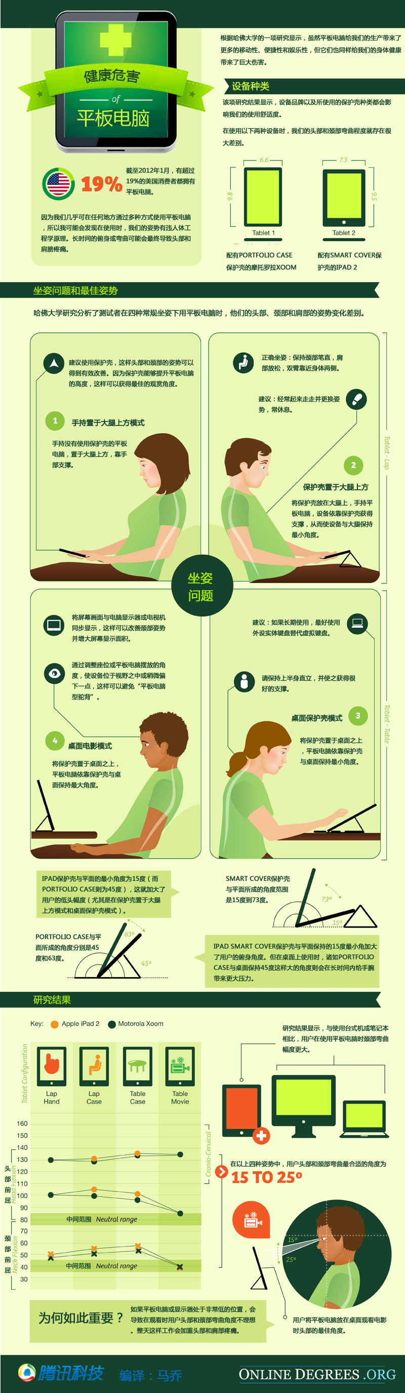 研究结果显示,与使用台式机或笔记本相比,用户在使用平板电脑时颈部弯曲幅度更大;受试者都要将头部和颈部调低15到20度。