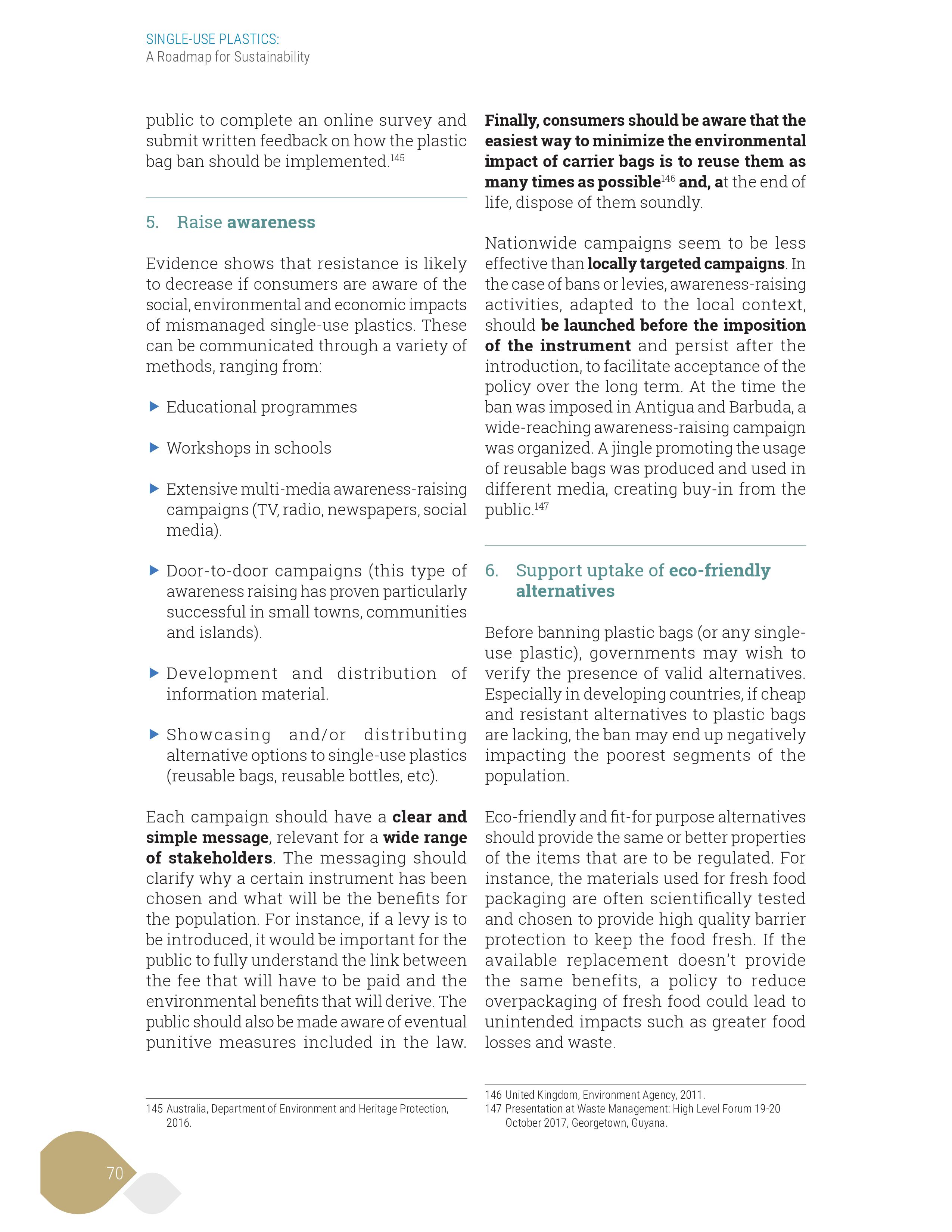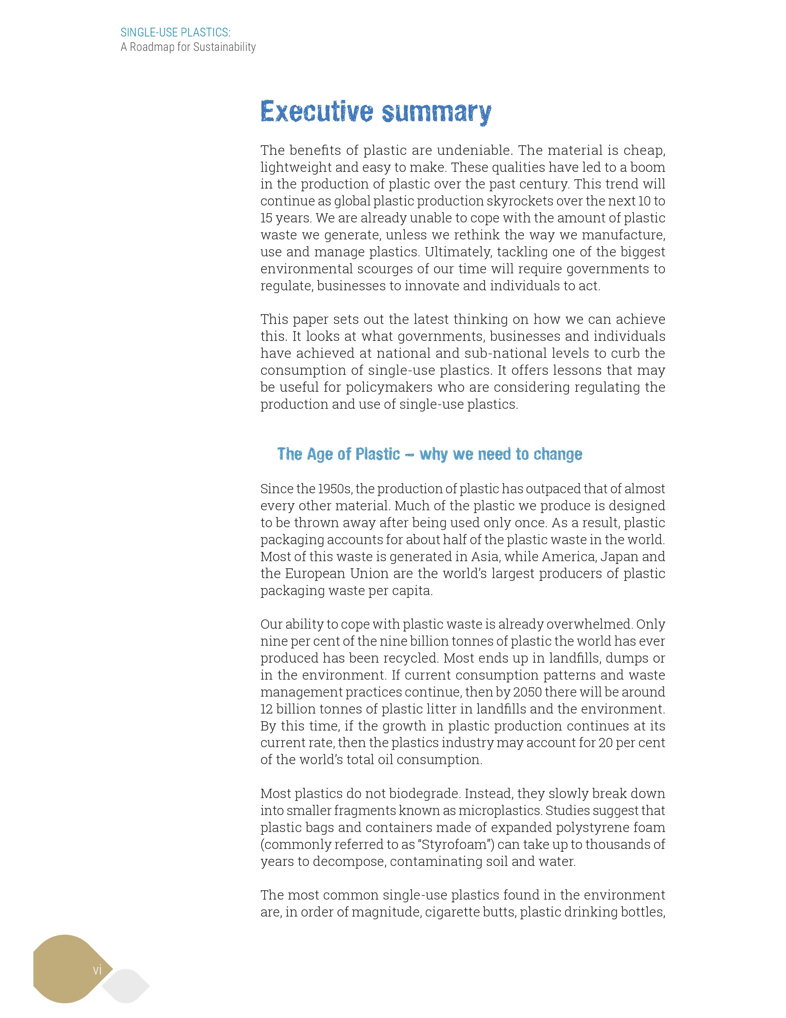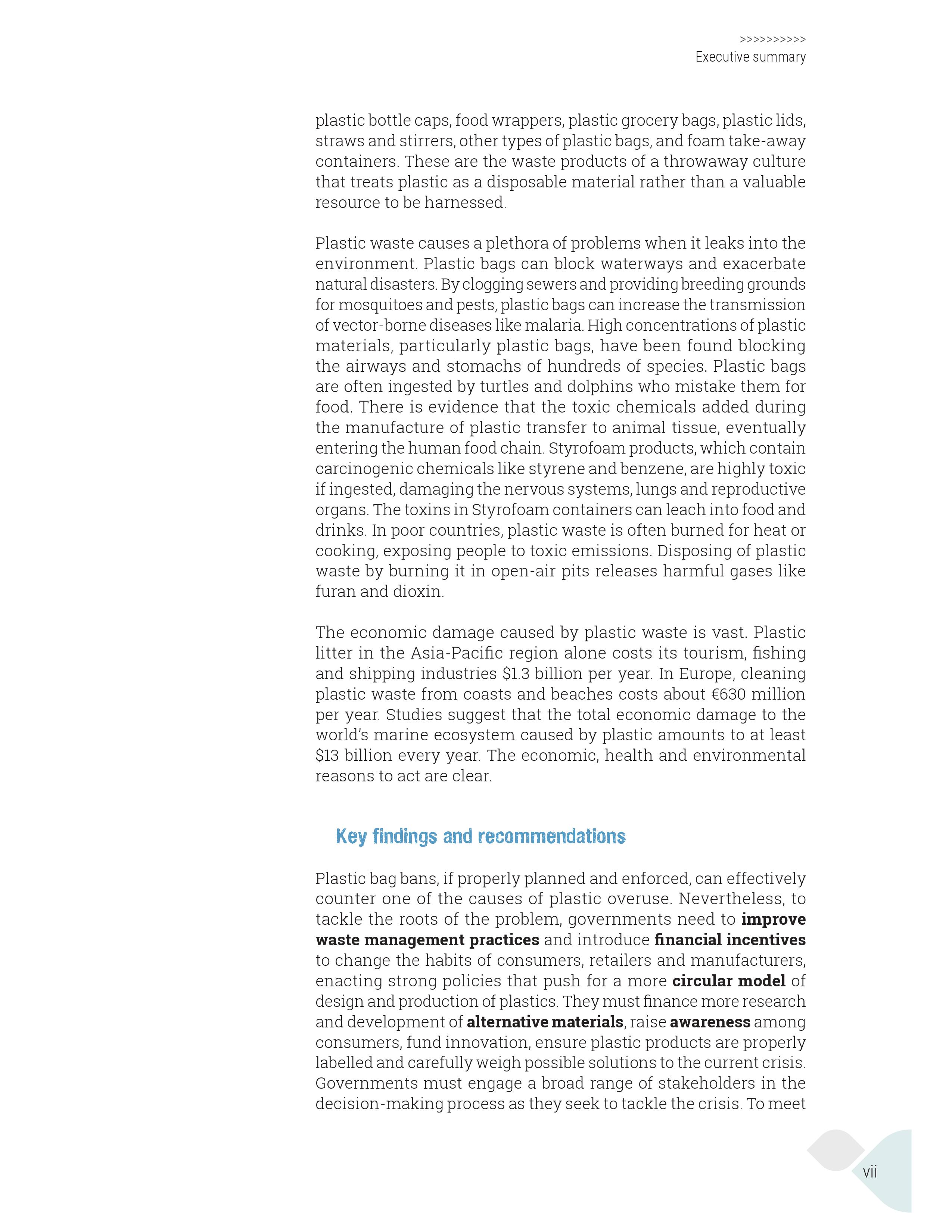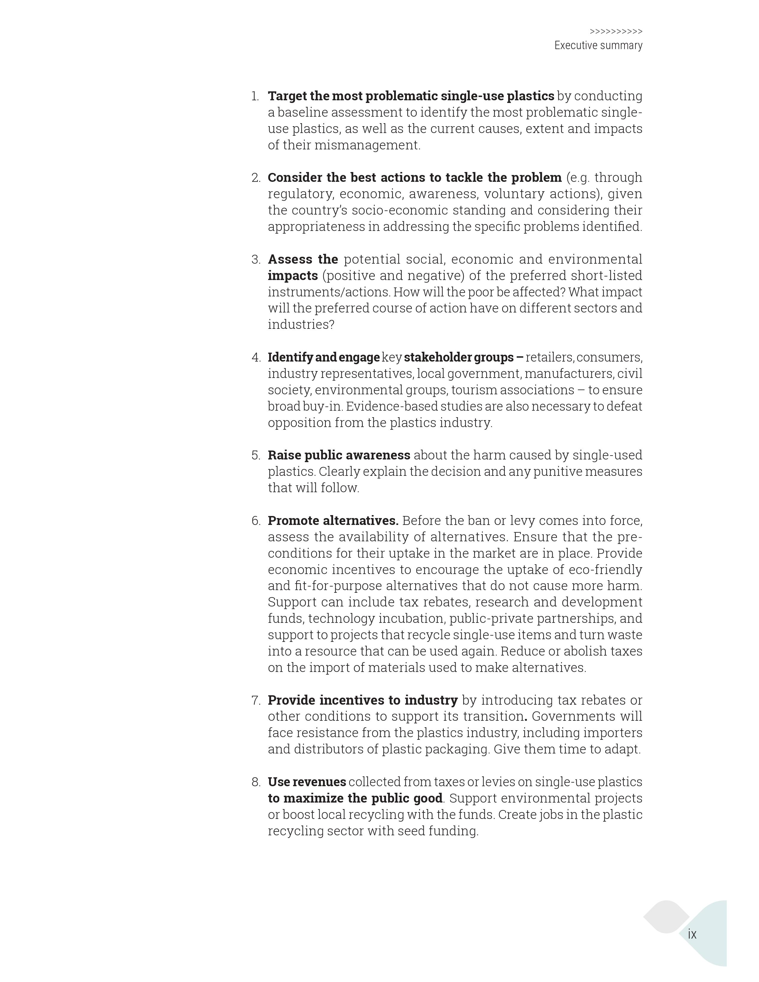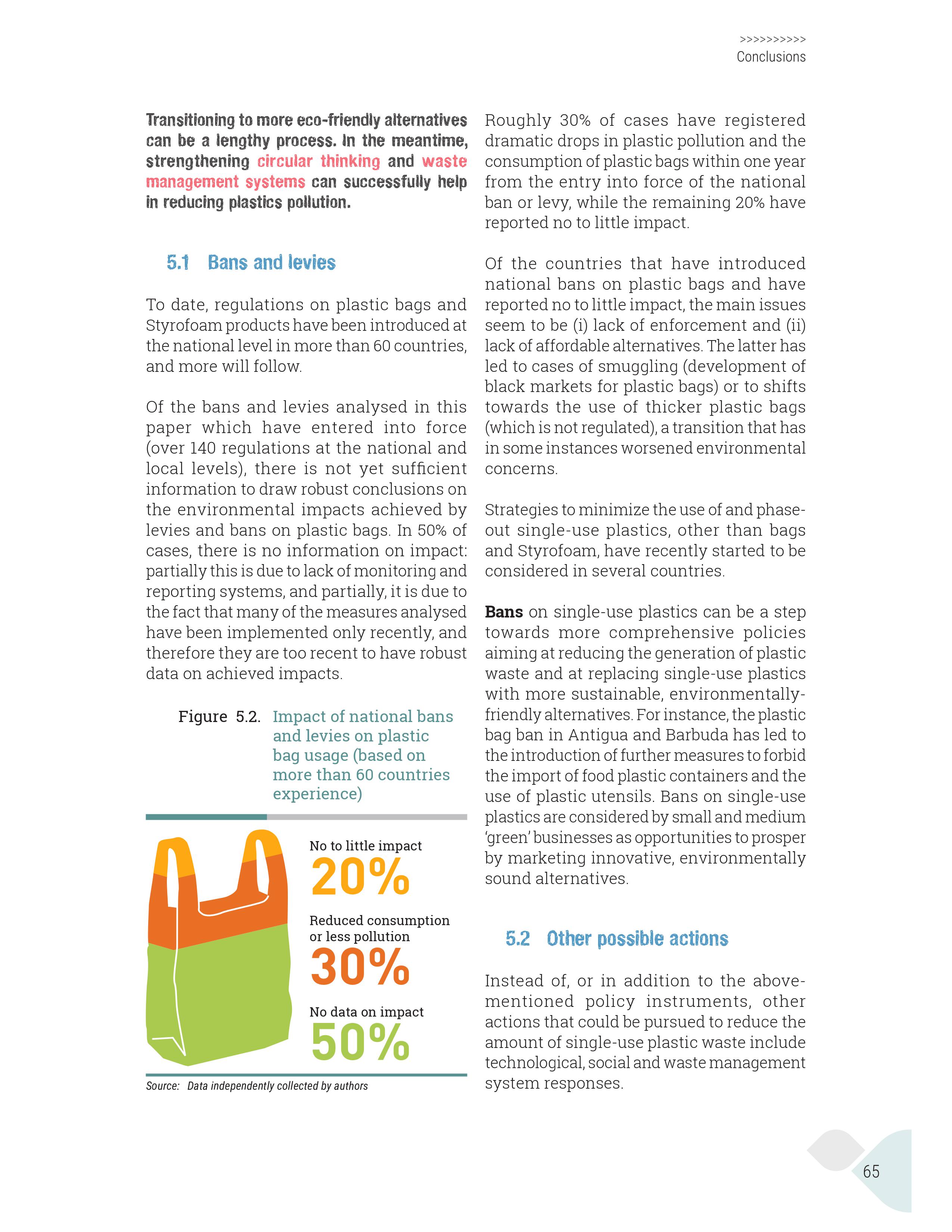如果有适当的计划和执行,禁止塑料带可以有效地应对塑料过度使用。但是,为了解决问题的根源,政府需要改进废物管理实践并引入财政激励来改变消费者、零售商和制造商的习惯,颁布强有力的政策,推动塑料设计和生产的更环保的模型。政府必须资助更多的替代材料的研究和开发,提高消费者的意识,为创新提供资金,确保塑料产品有适当的标签,并仔细权衡当前危机的可行性解决方案。