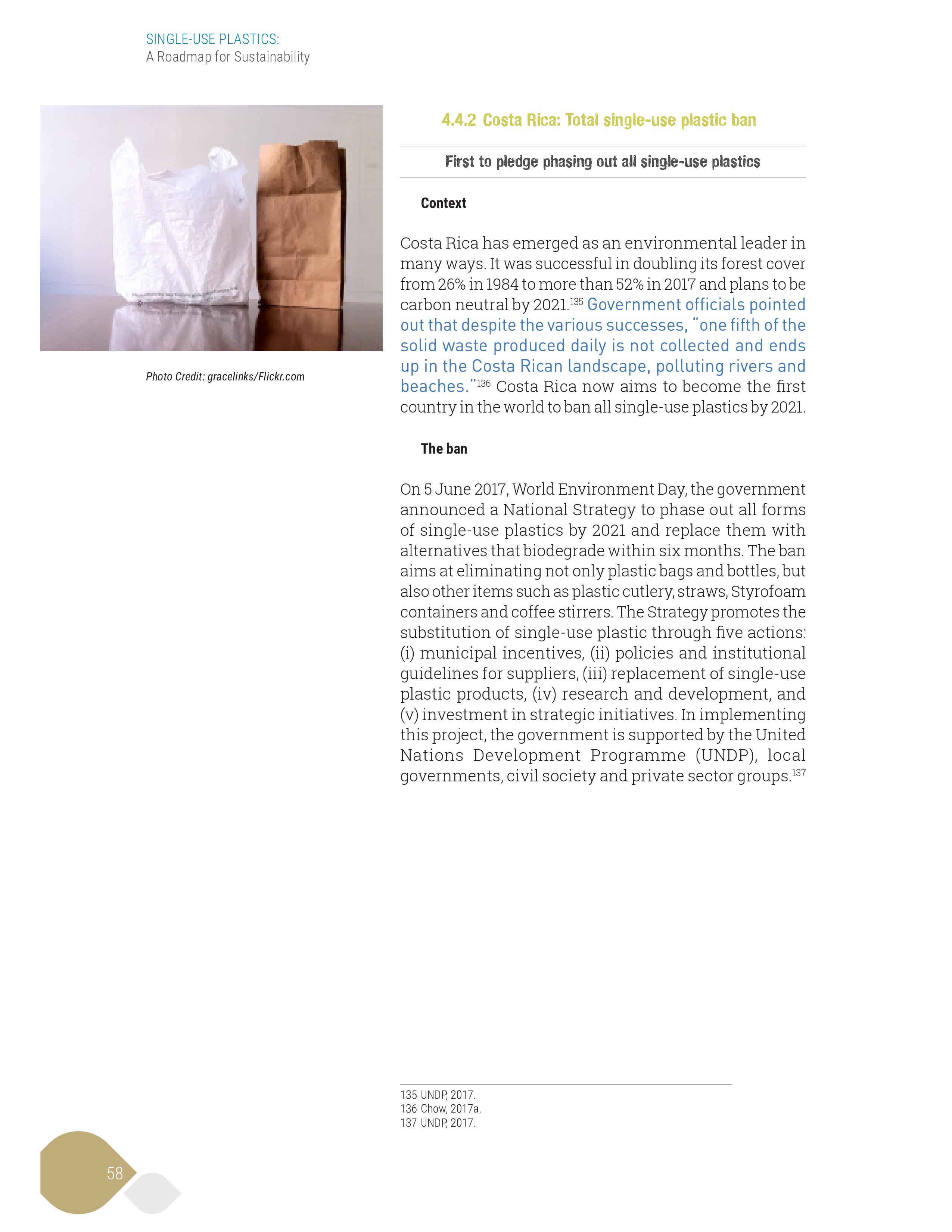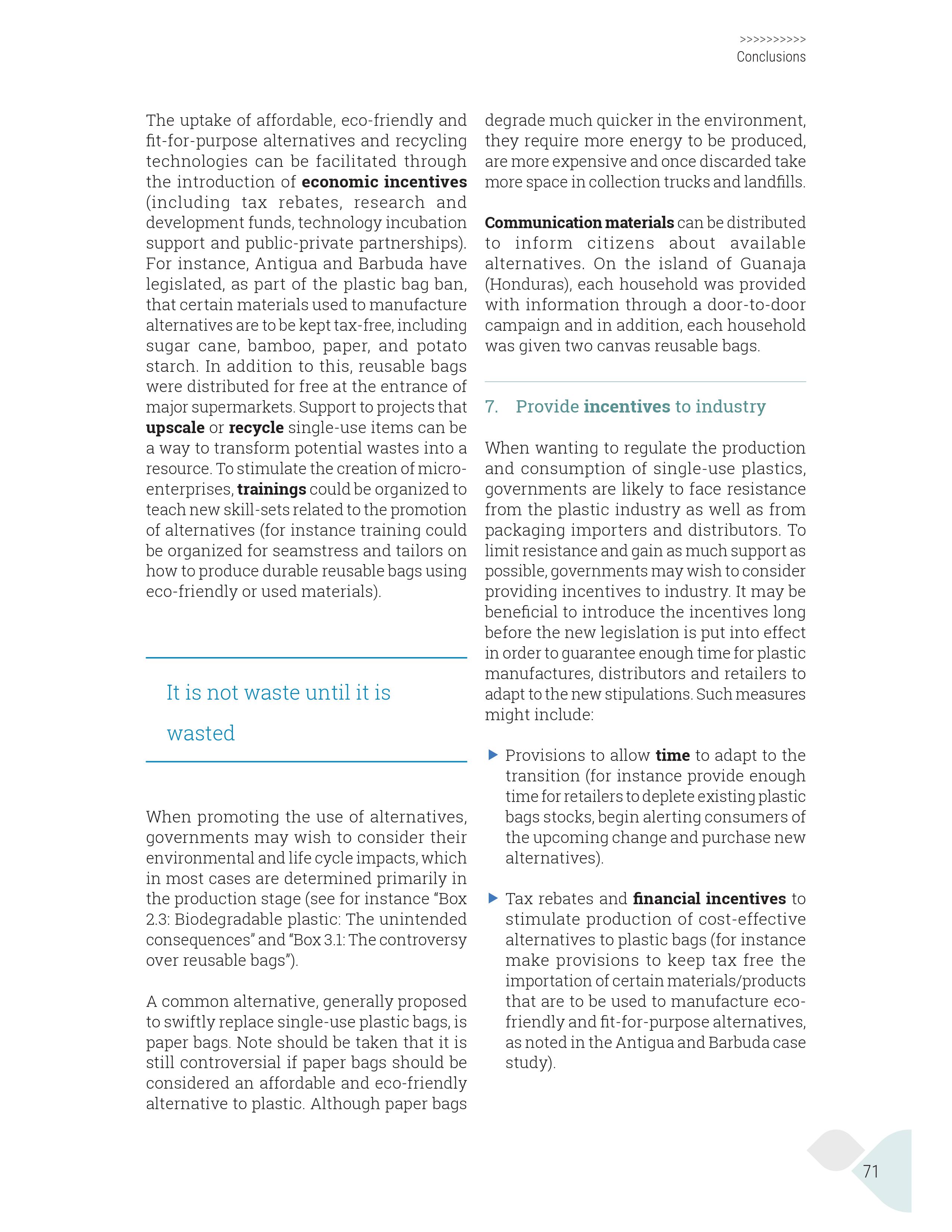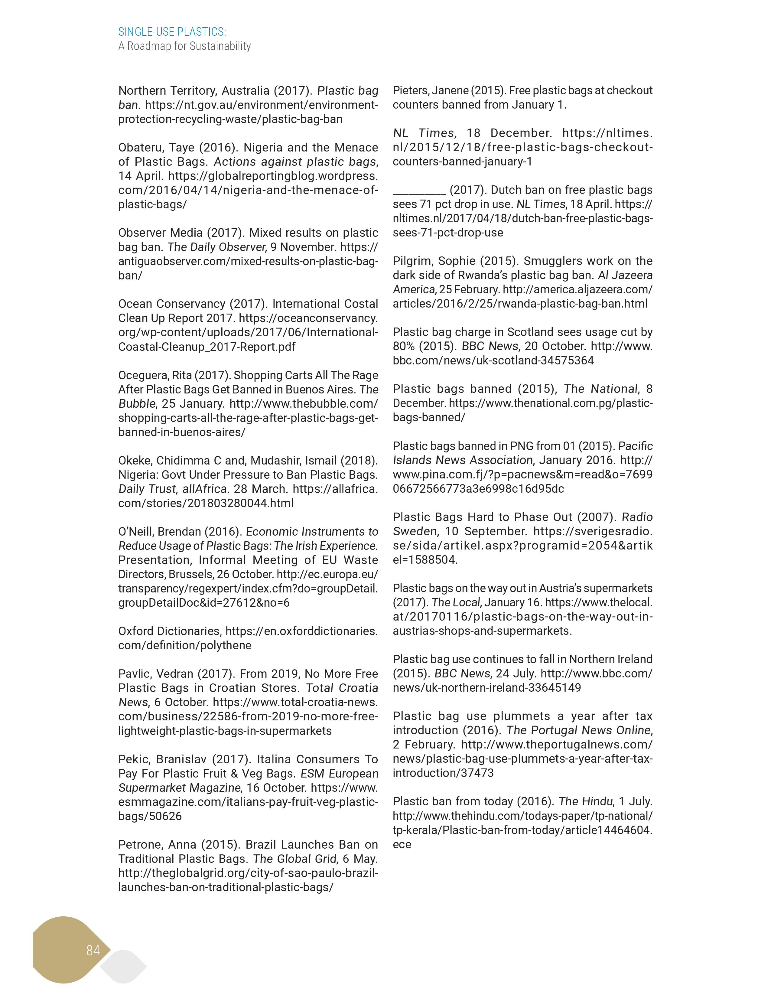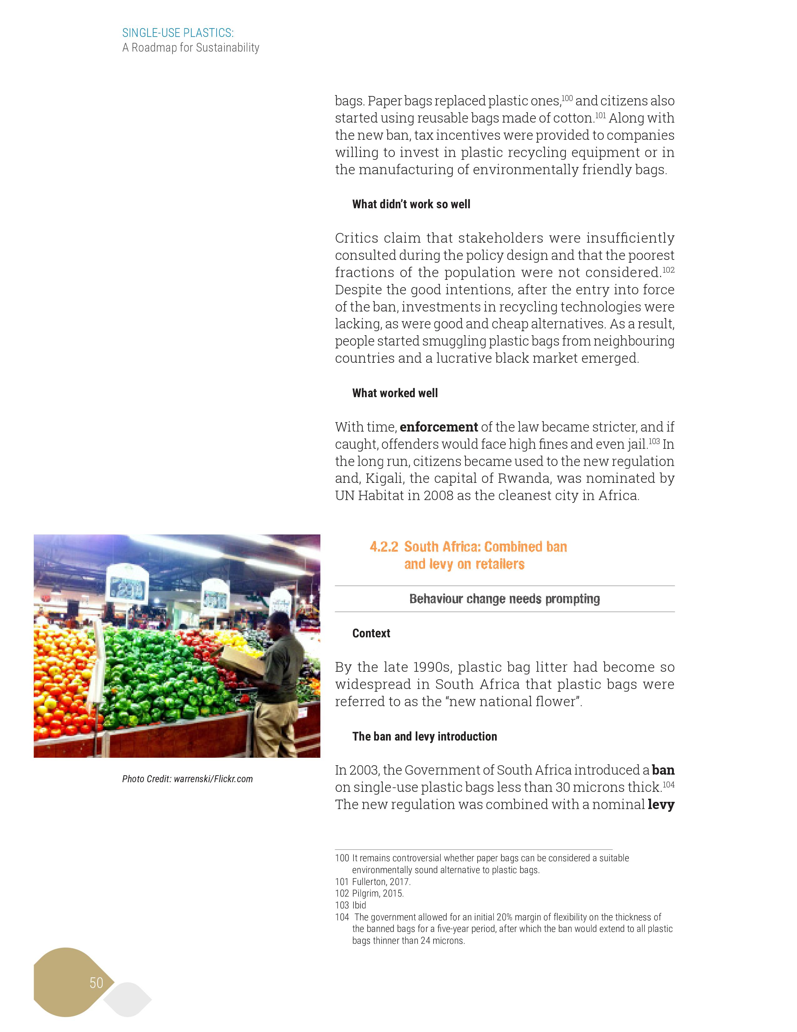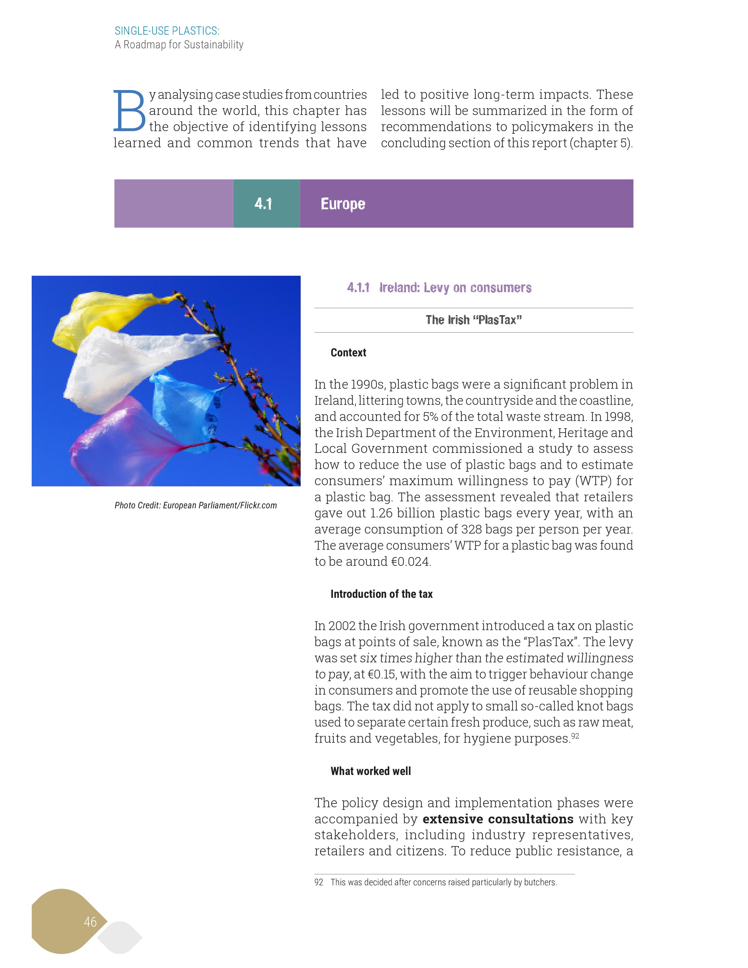 如果有适当的计划和执行,禁止塑料带可以有效地应对塑料过度使用。但是,为了解决问题的根源,政府需要改进废物管理实践并引入财政激励来改变消费者、零售商和制造商的习惯,颁布强有力的政策,推动塑料设计和生产的更环保的模型。政府必须资助更多的替代材料的研究和开发,提高消费者的意识,为创新提供资金,确保塑料产品有适当的标签,并仔细权衡当前危机的可行性解决方案。