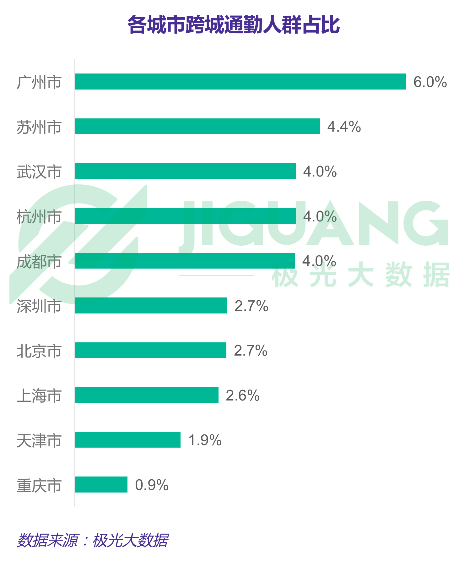 - 广州市跨城通勤人群占比达6%,苏州市达4.4%,武汉市达4%