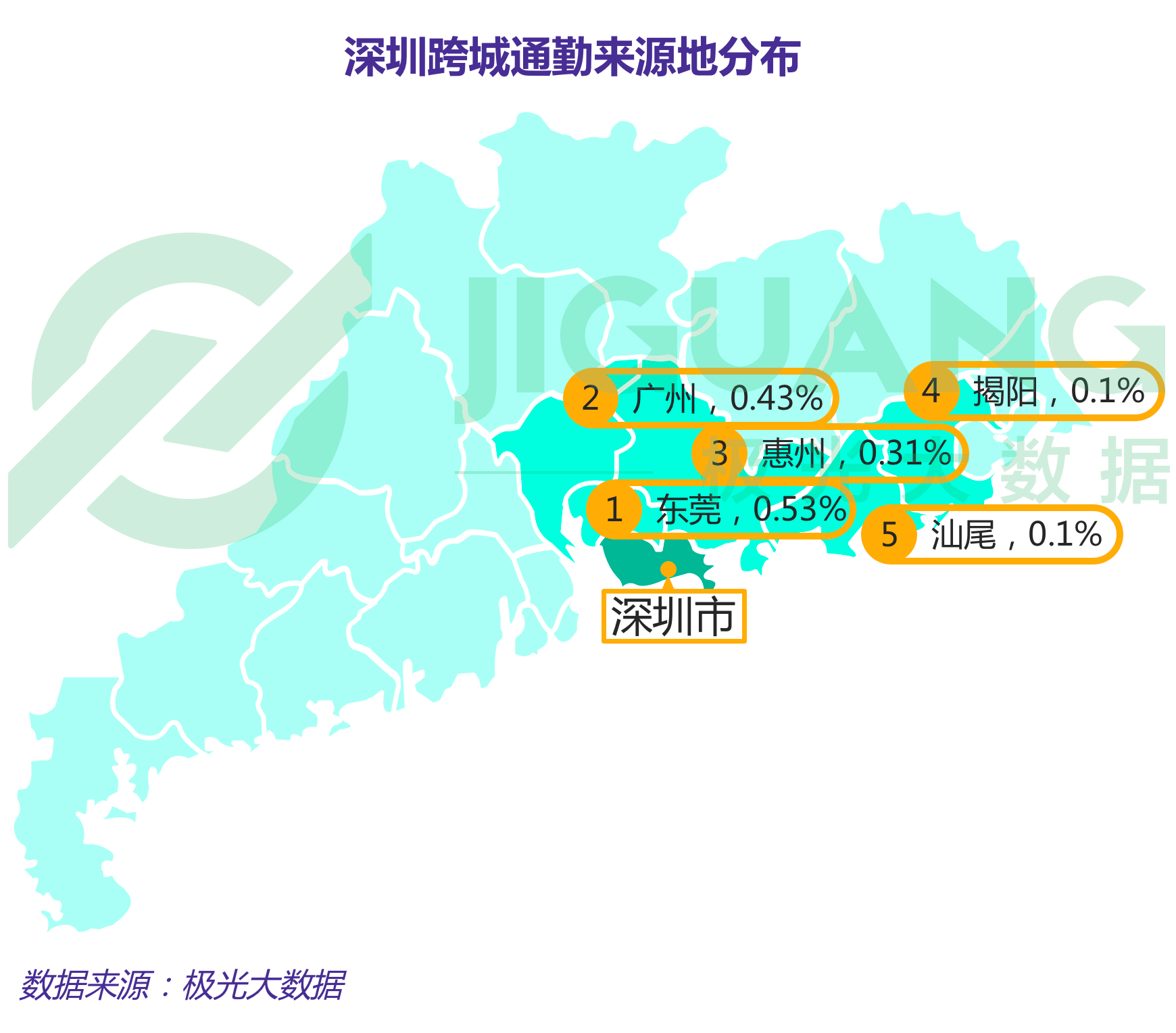 - 东莞-深圳的跨区通勤人群在深圳整体通勤人群中的占比达0.53%