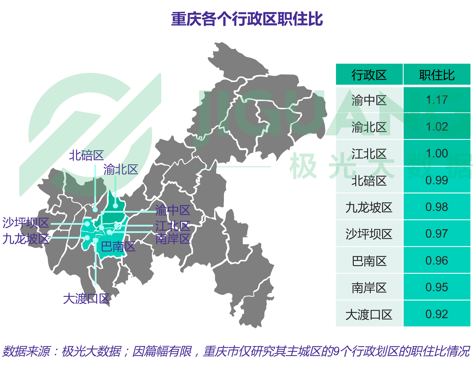 - 在重庆主城区中,渝中区职住比达1.17,渝北区职住比为1.02,江北区职住比为1