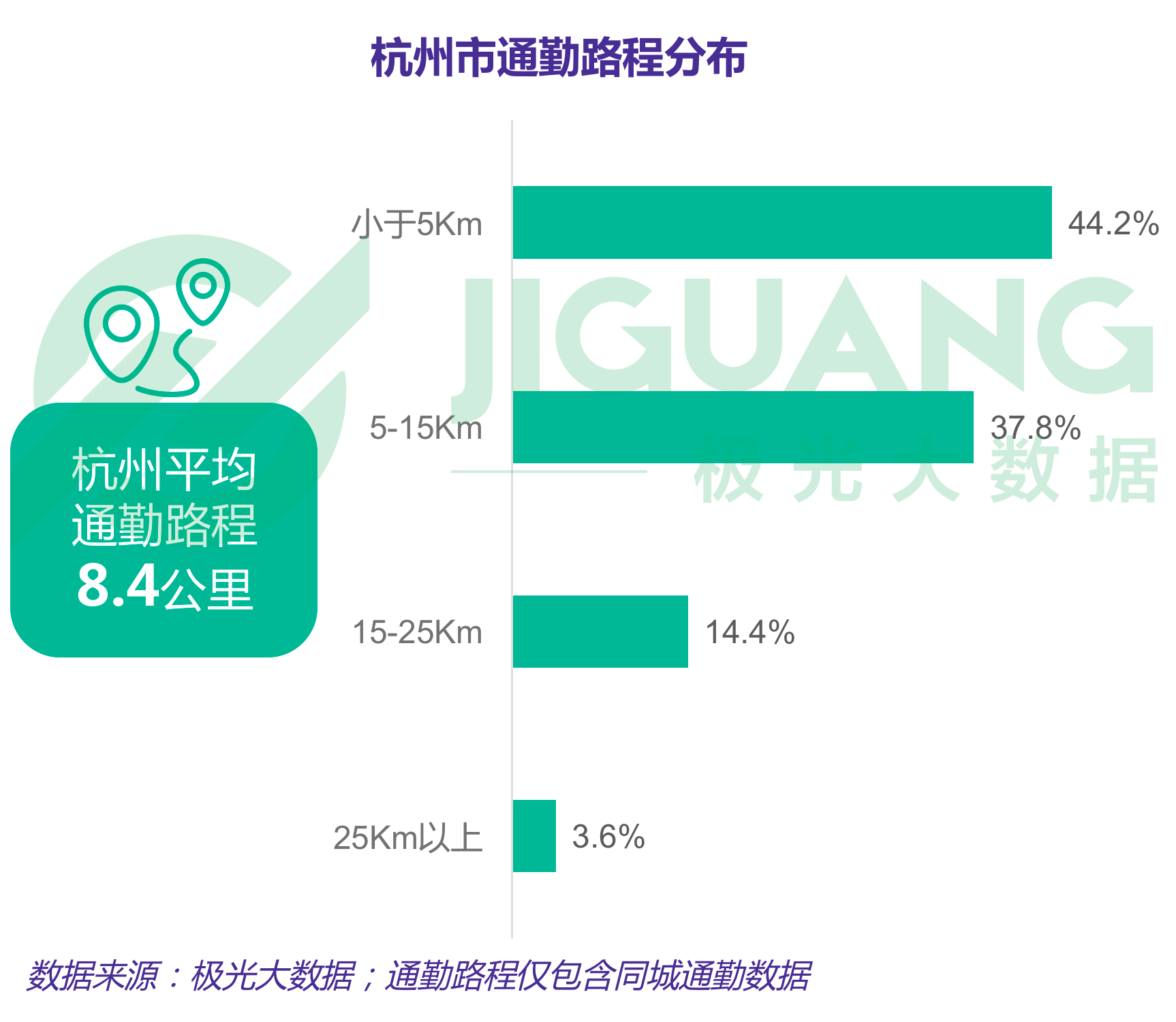 - 杭州市平均通勤路程为8.4公里,其中,小于5公里通勤路程的群体占比44.2%,5到15公里之间通勤路程的群体占比37.8%,15到25公里之间通勤路程的人群占比14.4%,超过25公里通勤路程的人群占比3.6%