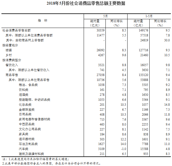 按消费类型分,5月份,餐饮收入3321亿元,同比增长8.8%;商品零售27038亿元,增长8.4%,而4月商品零售增长9.4%。