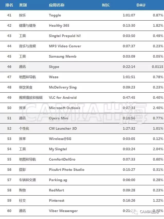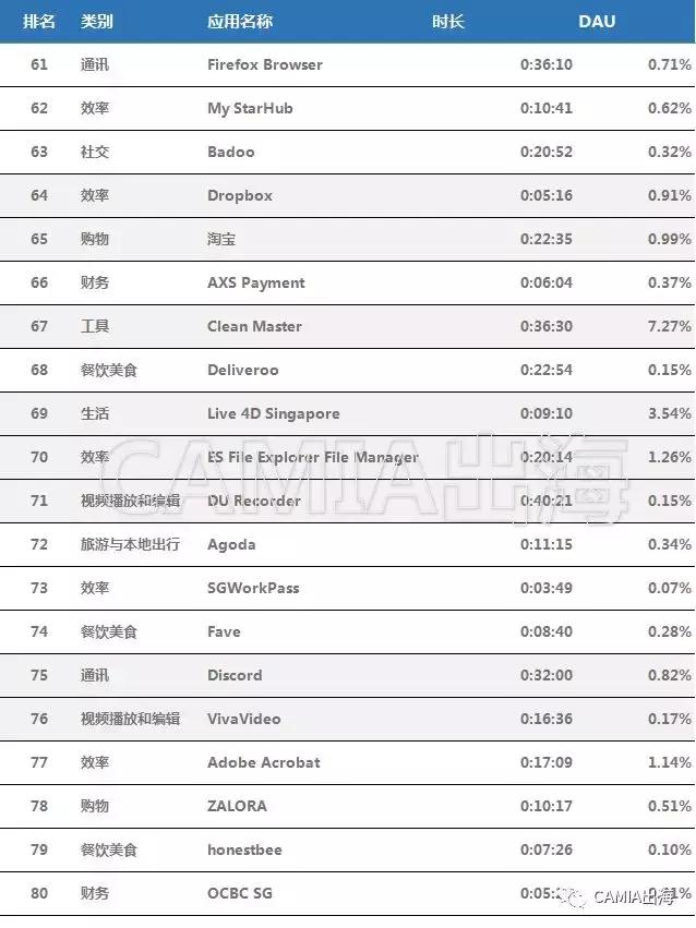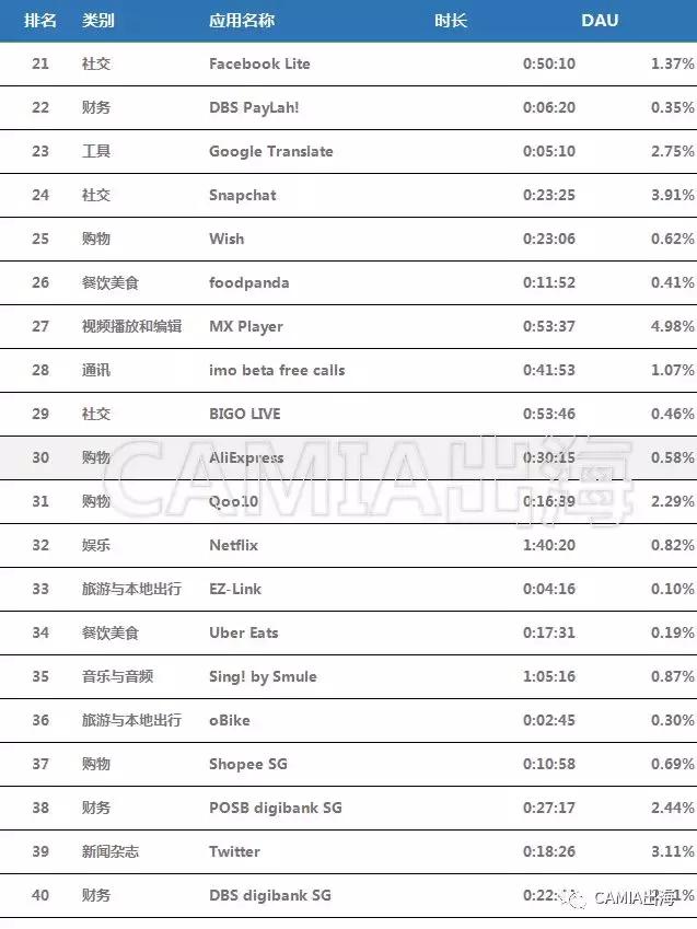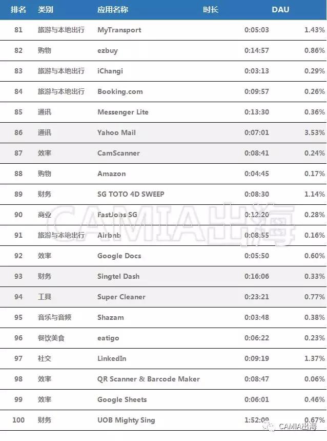 与印尼、泰国和菲律宾三个市场不同的是,新加坡市场的通讯类占比最大,其中购物类和效率类应用也占据较大比例。其中旅游与本地出行类在其他三个市场占比相对比较低,而在其他市场占比较大的工具类应用没有出现在新加坡TOP5类应用中。