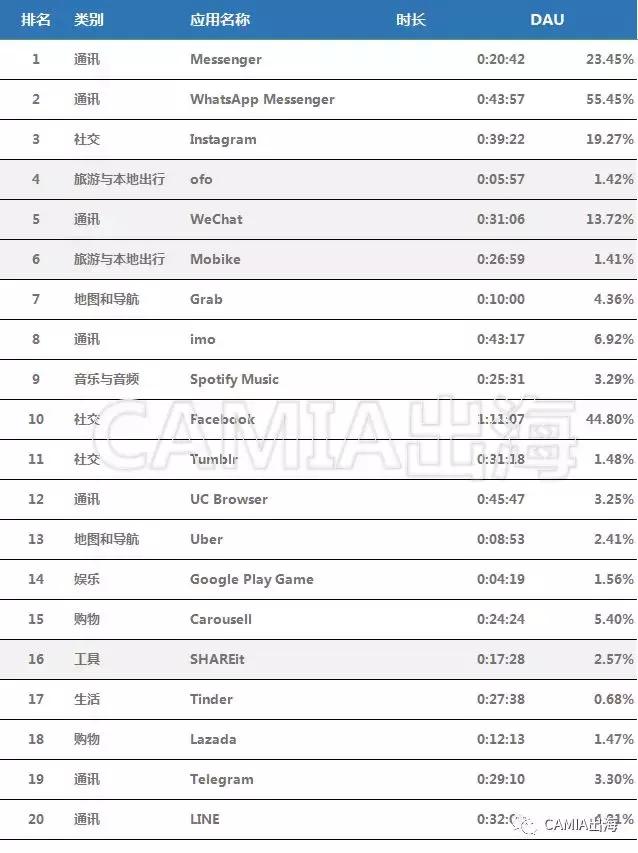 TOP应用榜单中的中国应用占20%,其中有三款应用排在榜单TOP10,包括《ofo》《WeChat》和《Mobike》。
