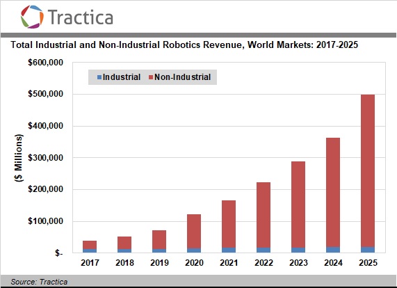 机器人市场正在经历深刻而重大的重组,因为传统工业机器人占整个机器人市场的比例继续萎缩。根据Tractica的最新数据,2017年非工业机器人占全球机器人市场(393亿美元)的70%,2016年占64%。到2018年底,非工业机器人份额将增长至76%,届时机器人市场将增长至527亿美元。