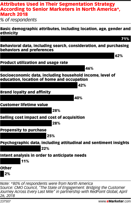 目前,大多数营销人员并没有将情境作为其策略的一部分。CMO Council和RedPoint Global于2018年3月进行的一项研究发现,大多数营销人员根据基本的人口统计特征,以及搜索和过去购物等行为数据对受众进行细分。只有11%的受访者使用意图分析,还有22%的营销人员使用心理学数据进行细分。营销人员可能将行为考虑在内,但在很大程度上忽视了情境和情感。