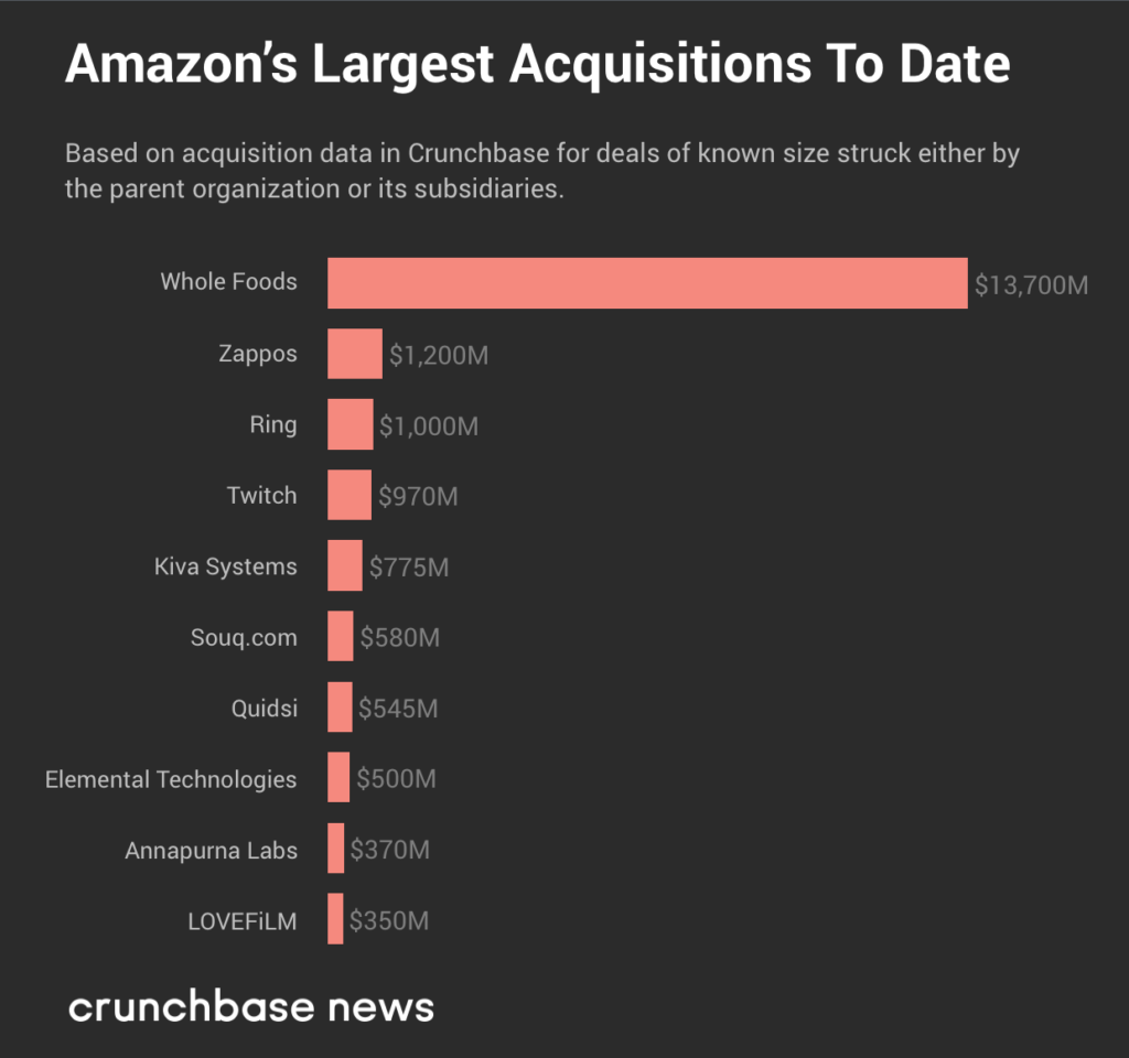 尽管在五大科技巨头中苹果的市值最高,它不仅是收购最少的,而且是最不公开的。换句话说,在Crunchbase和其他地方列出的交易中,大多数苹果的并购交易没有报道并购额。