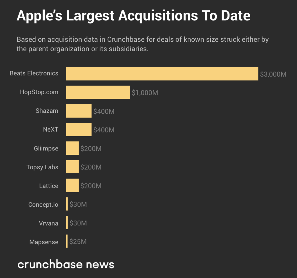 迄今为止,苹果最大的并购交易是以30亿美元收购Beats Electronics。