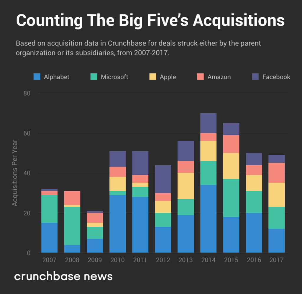 综合来看,五大科技巨头在整个并购市场占有相对较小的份额。下图显示了2007-2017年五大科技巨头收购情况。